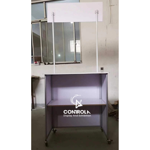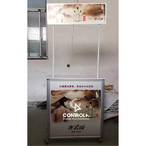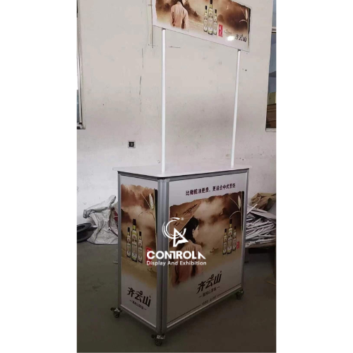 Quầy bán hàng di động nhôm có bánh xe là mẫu booth sampling đáp ứng được diện tích trưng bày nhỏ hơn 60cm theo yêu cầu thời gian gần đây của một số siêu thị.